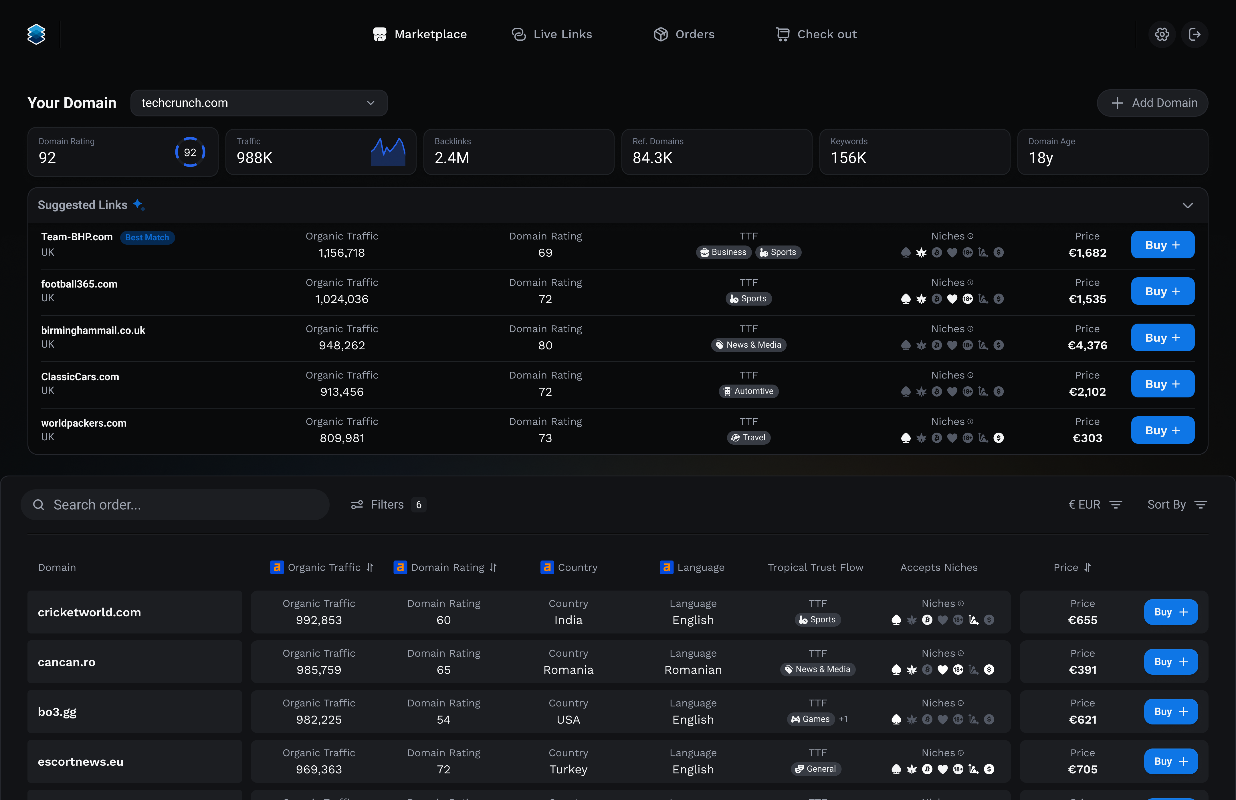 Discover verified publishers, compare SEO metrics, and place orders backed by real data. Filter by traffic, category, region or niche. Pay with invoice or credit card. Links go live within 24h.